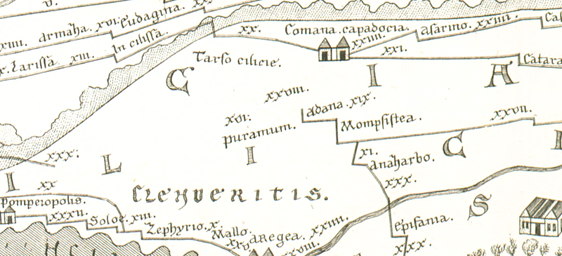 Die Straßenlinie aus 9B3 In monte bricht in der Mitte ab, weist aber eindeutig in Richtung Priamum, nicht nach 9B3 Pompeiopolis, wie Talbert in seinem Kommentar vorsichtig vermutet hat. In Wirklichkeit dürfte die Straße jedoch von 9B3 In monte Tauro über 9B4 Tarso cilicie nach Piramum verlaufen sein (s. ItMiller 692). |
