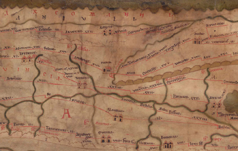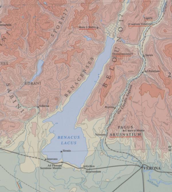 Miller, Itineraria, Sp. 388: Fl` Afesia (irrig Atesia und Afefia (Bt, Bg)), Athesis (Verg, Sil, Claud, Flor, Pl), Ἀτησινὸς (St), Ἀτισών (Plut); entspringt auf den Rätischen Alpen, der Hauptfluß von Rätia I, ergießt sich in mehreren Mündungen ins Adriatische Meer. Auf der Karte ist er ein linker Nebenfluß des Padus; j. Adige oder Etsch. |