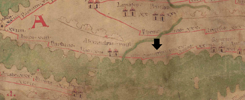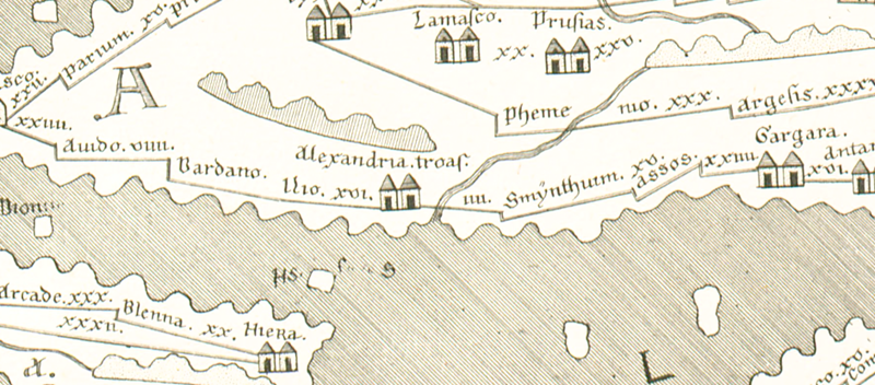 Der Name ist stark verwischt und zwei Buchstaben sind fast unleserlich, aber die Transkription Sminthium von ItMiller 698 scheint korrekt zu sein. Für das “y” von Smynthium, das in den Editionen von Bertius, Bergier, Welser, Podocatharus und Katancsich erscheint, fehlt zwischen dem noch gut erkennbaren “m” und dem noch sichtbaren oberen Teil des “n” der Platz; hier ist noch der obere Teil einer einzelnen Haste zu erkennen, die sich am besten mit Miller als “i” deuten lässt. |