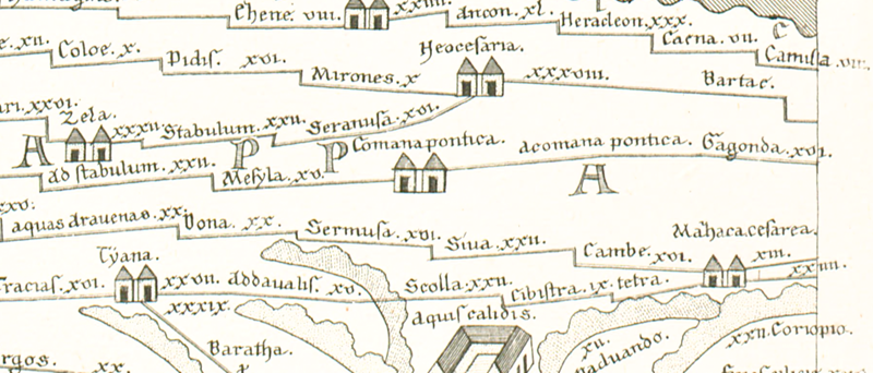 Zum Casus: Die rechts neben der Ortsvignette eingetragene Legende “Acomana pontica Gagonda XVI” lässt darauf schließen, dass es sich hier um ein fem. sing. handelt, wie auch bei Ptol. (allerdings verwendet die TP die Formen der Ortsnamen nicht immer konsequent, so dass auch ein neutr. pl., als Nominativ oder Richtungsakkusativ, nicht ausgeschlossen werden kann). |