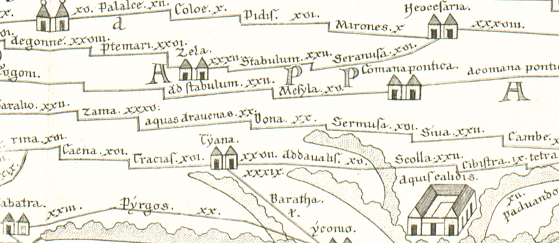 Dona ist wahrscheinlich verschrieben aus Doara (s. Ramsay 1890, 268, der den Ort mit Ὀδώγα, einem bei Ptol. 5,6,12 aufgeführten Ort in der Strategia Chamamene identifiziert (Ζάμα = 9B1 Zama auf der TP - Ἄνδρακα – Γαδάσηνα - Οὐάδατα – Σαρούηνα = 9B1/2 Aquas Arauenas - Ὀδώγα), sowie mit dem Bistum Doara. Der Name erscheint als Δόαρα (neutr. pl.), z. B. bei Basileios von Kaisareia epist. 231,1; 239,1; Gregor. Naz. orat. 13,1; Notit. Episc 3,435 u. ö., entstellt zu Δωάρον z. B. Epiphan. 420 (als Suffragan von Mokisssos); Διάρων Notit. Episc. 13,397, dem Ῥεγεδόαρα (< ῥεγεὼν Δόαρα) bei Hierokl. synekd. 700,8 (Ort der Eparchie Cappadocia secunda), s. Zgusta 1984, 163f. |