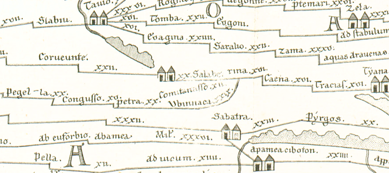 Die Folgestation Vbinnaca ist unter Comitanasso eintragen statt, wie zu erwarten, rechts davon, da sich der Kartograph beim Einzeichnen der Straßenlinie wohl in der Länge verschätzt hat (s. Art. 9B1 Petra). |