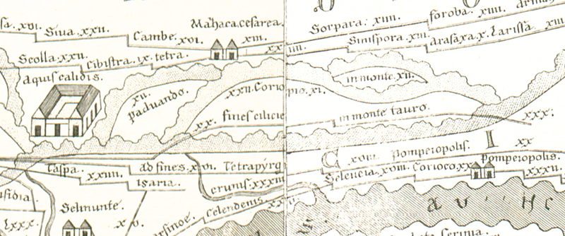 Offenbar ein Grenzort, wie er auf der TP und in Itinerarien häufig begegnet, in diesem Fall, wie ItMiller 692 inferiert, zwischen Lycaonia (das auf der TP nicht gekennzeichnet ist) und Cilicia (dessen roter Namenszug tatsächlich links darunter beginnt). |