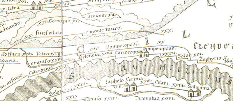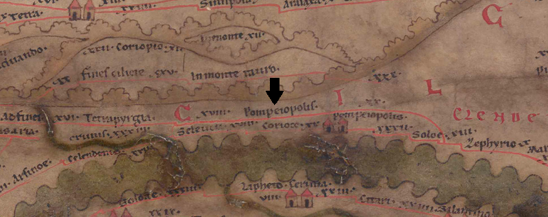 Pompeiopolis, in Wirklichkeit eine Küstenstadt, ist ein zweites Mal (korrekter) rechts darunter eingetragen, dort mit Zweiturmvignette. Es handelt sich außerdem de facto und denselben Ort wie die Folgestation und Soloe, so dass eine Stadt hier versehentlich insgesamt dreimal eingezeichnet ist. |