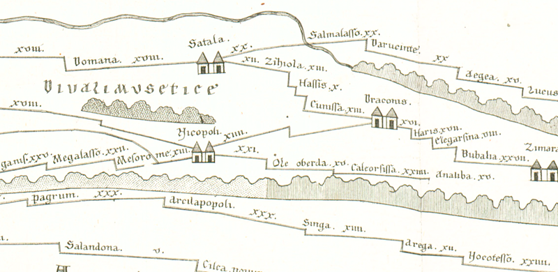 ItMiller 675 vermutet hier den Ausfall von einer oder zwei Stationen, etwa von Olotoedariza (BAtlas 87 D4) bzw. Olotoaelariza, das laut ItAnt 183,2; 207,1 und 215,13 24 Meilen von der vorangehenden Station Nicopolis entfernt war. |