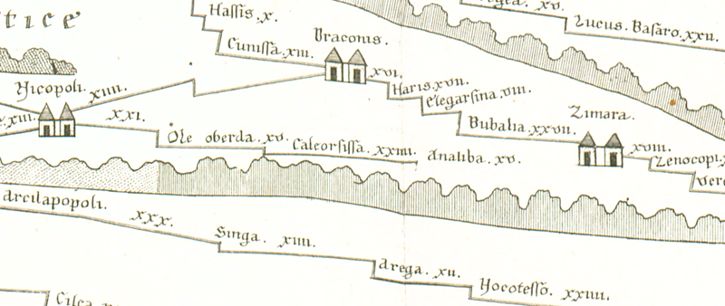 Lag in Wirklichkeit südöstl. der voraufgehenden Station Caleorissa und nordöstl. der Folgestation Zimara (heute: Pingan). Auf der TP liegt Analiba, anders als im ItAnt (s. u.), auf einer Verbindung von 9A5 Nicopoli nach Zimara (und zwar 15 Meilen vor Zimara), wahrscheinlich ein Irrtum, wie auch das Fehlen der roten Straßenlinie nahelegt (s. Mitford 2018, vol. 1, 257). |